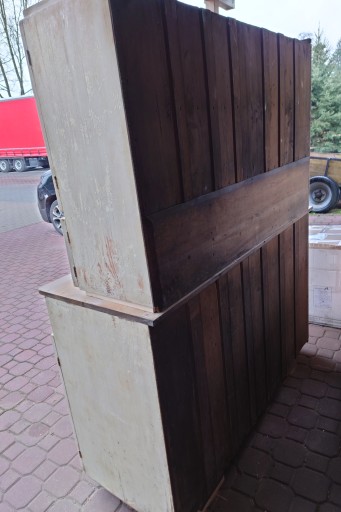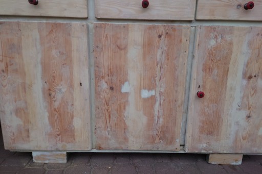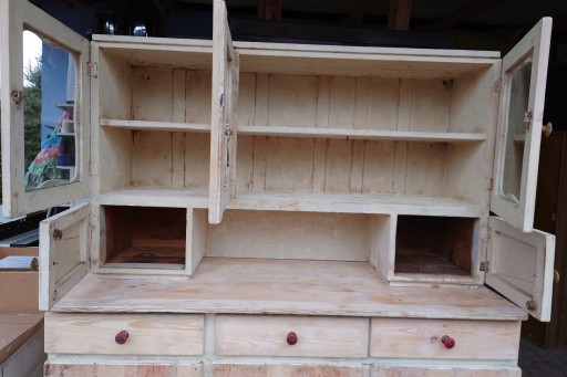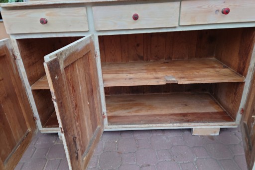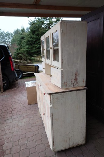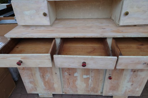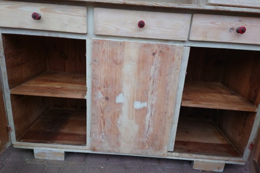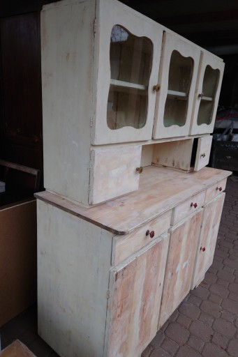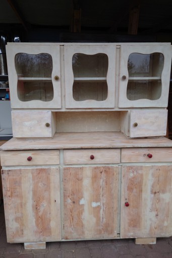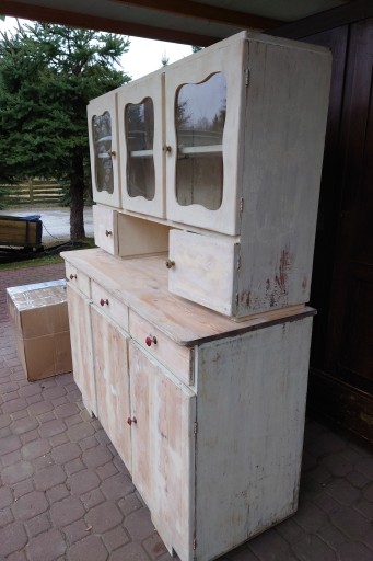 Dobry stan śliczny stary kredens kuchenny ale w miarę dobrze utrzymany , solidne jeszcze zdrowe drzewo, mocne szuflady , stan jak na zdjęciach , ściągnięta wierzchnia warstwa starej farby przygotowany do renowacji odnowienia , brak jednej oryginalnej gałki , ale nie przeszkadza w użytkowaniu i nie rzuca się w oczy