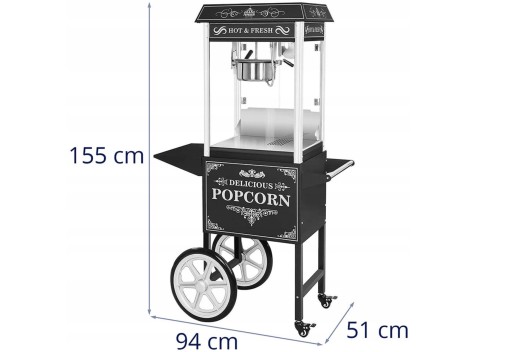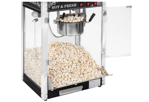 Prezentowany automat do popcornu wyposażony został w wydajny termostat o mocy 1600 W. Sprawia on, że w ciągu godziny możliwe będzie przygotowanie do 6 kg prażonej kukurydzy, która dzięki podgrzewanemu dnu maszyny jest zawsze świeża i ciepła. Podświetlane wnętrze gabloty ze szkła hartowanego zapewnia dobrą widoczność i pozwala zaprezentować przekąskę nawet w po zmroku.