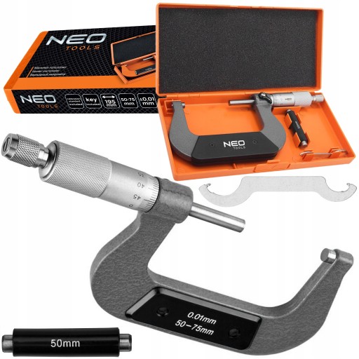 Mikrometr noniuszowy 50-75 mm 75-022 NEO to precyzyjne urządzenie, przeznaczone do dokonywania dokładnych pomiarów nawet bardzo małych elementów, z dokładnością do ± 0,01 mm. Narzędzie będzie niezbędne w każdym warsztacie samochodowym, zakładach przemysłowych, ale również w domu, podczas remontów oraz drobnych napraw. Charakteryzuje się bardziej precyzyjnymi wynikami niż suwmiarki.