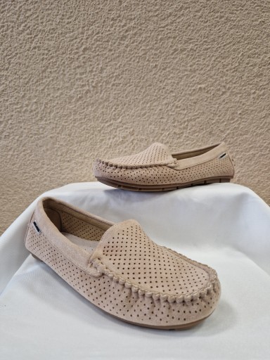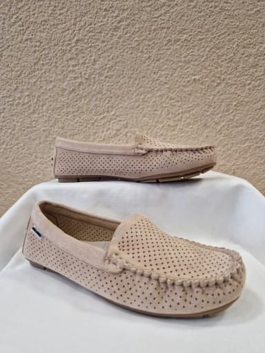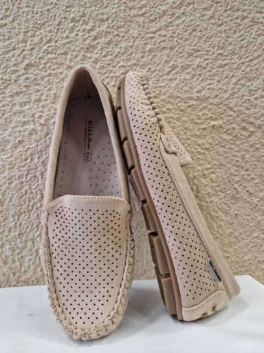 MOKASYNY BELLA PARIS płaskie na grubej podeszwie z protektorem. Wsuwane z noskiem o zaokrąglonej krawędzi. Perforowane, wykonane z ekozamszu. Na górze przeszycie charakterystyczne dla tego fasonu. Wkładka ze skóry naturalnej.