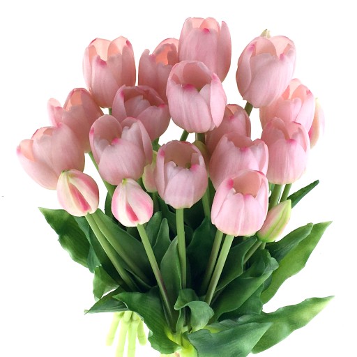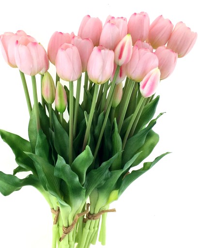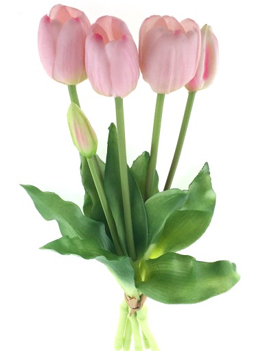 BUKIET 5 GUMOWYCH TULIPANÓW związanych w pęczek. Bukiet o wysokości 39 cm. Tulipany wykonane z gumowanego silikonu - w dotyku jak żywe. W każdym pęczku znajduje się 5 pojedynczych, jasno różowych tulipanów w różnym stanie rozkwitu. Główki kwiatów o średnicy 2-3,5 cm i wysokości 5 cm. Listki cieniowane w kolorze wiosennej zieleni.