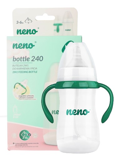 Wielozadaniowe butelki do karmienia i nauki picia Neno Bottle to sposób nie tylko na jedzenie czy picie, ale także relaks, ćwiczenie warg i języka oraz naukę chwytania. Neno Bottle 240 ml przeznaczona jest dla dzieci pomiędzy 3-6 miesiącem życia.