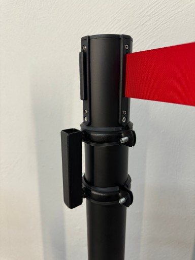 - Słupki odgradzające (czarne) z czerwoną taśmą (2,2m) na ciężkiej podstawie z z autorskimi uchwytwami do lamp (uchwyty stalowe, malowane proszkowo na czarno) oraz z czarnymi obejmami - 5 szt.