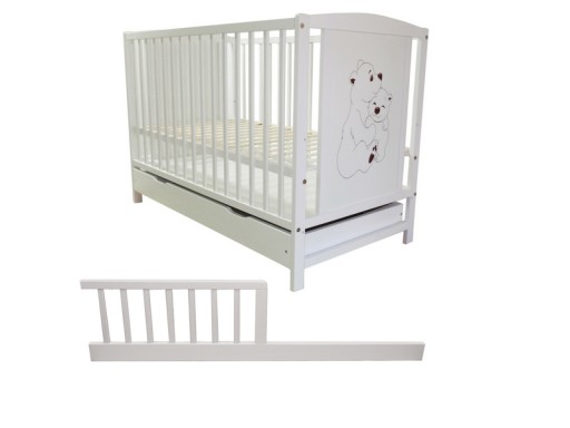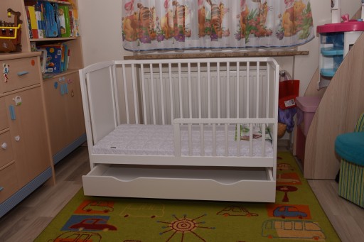 Łóżeczko wykonane jest z drewna sosnowego I gatunku, z możliwością zamiany na tapczanik dla starszego dziecka poprzez wymontowanie boku i zamontowaniu "drabinki" zabezpieczającej (drabinka zabezpieczająca w zestawie), natomiast szczyty i szuflada z płyty meblowej, pokryte nietoksycznymi farbami i lakierami posiadającymi atest.