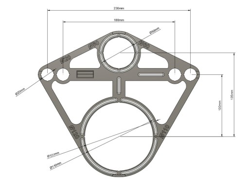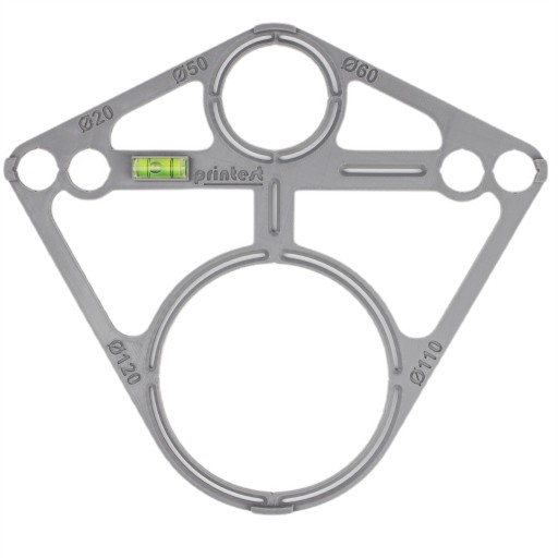 Ten specjalistyczny przymiar jest kompatybilny z dwoma rodzajami rozstawów szpilek: 180mm oraz 230mm. Co więcej, posiada otwory o średnicach 20mm, 50mm, 60mm, 110mm oraz 120mm, które są odpowiednio oznaczone, ułatwiając identyfikację. Dodatkowe znaczniki pionu i poziomu umożliwiają perfekcyjne ustawienie przymiaru.