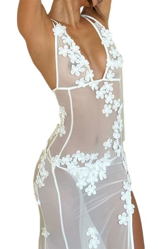Długa prześwitująca koszula nocna biała dopasowana z rozcięciem SEKSOWNA.