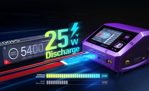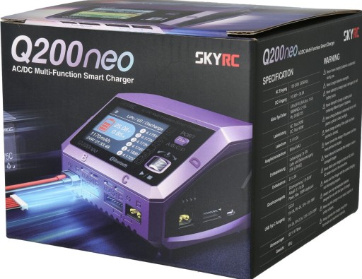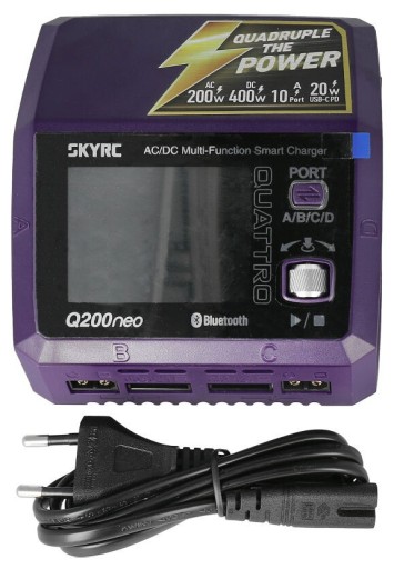 SkyRC Q200neo to najnowsza i ulepszona wersja ładowarki Q200, wyposażona w innowacyjne rozwiązania i ulepszoną funkcjonalność. Umożliwia ładowanie 4 różnych akumulatorów jednocześnie i może być zasilana zarówno za pomocą prądu stałego, jak i zmiennego. Wyróżnia się mocą nawet 400 W i wbudowanym balanserem o wysokiej precyzji, który optymalizuje wyrównywanie napięcia w zakresie ±0,02 V. Mimo swoich potężnych możliwości produkt jest zaskakująco niewielki i poręczny.