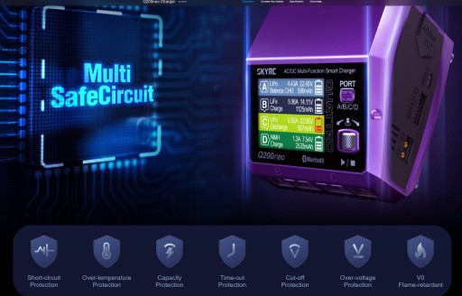 Ładowarka SkyRC Q200neo jest wyposażona w kilka podstawowych funkcji bezpieczeństwa zapewniających optymalne bezpieczeństwo ładowania.