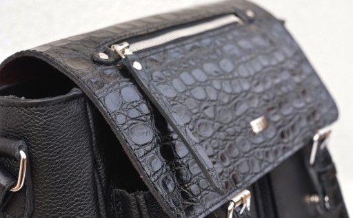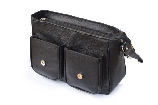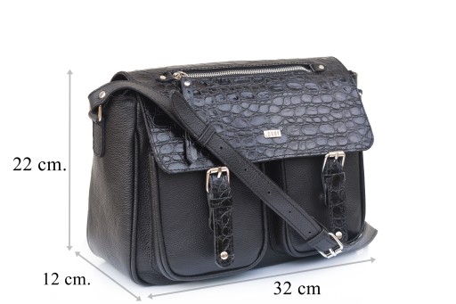 Średniej wielkości skórzana torebka damska w kolorze czarnym, ozdobiona subtelnymi detalami. Zamykana na suwak, posiada praktyczne przegródki wewnątrz. Doskonała na różne okazje.