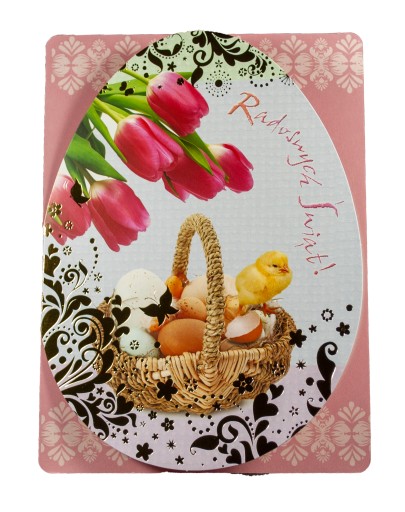 Front kartki wycięty jest w kształcie wielkanocnej pisanki
