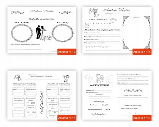 Posiadamy 16 modeli ankiet weselnych, dostępnych po zakupie.