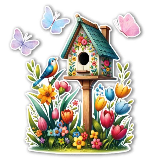 - Dom dla ptaków ozdobiony kwiatami – Wymiary: 25,2 cm szerokości x 32,6 cm wysokości.