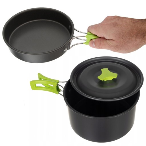 W skład zestawu naczyń kuchennych wchodzi wiele elementów, w tym garnek, czajnik, patelnia, 2x nóż, widelec, łyżka składne, 2x karabińczyk, 2x kubek składany, woreczek do przechowywania. W zestawie znajdują się również woreczki na sztućce.