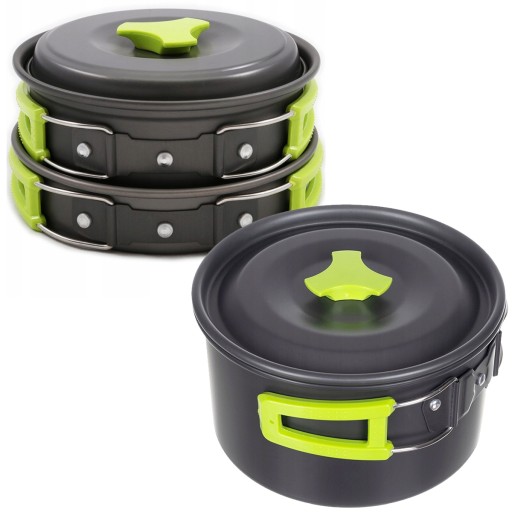 W skład zestawu naczyń kuchennych wchodzi wiele elementów, w tym garnek, czajnik, patelnia, 2x nóż, widelec, łyżka składne, 2x karabińczyk, 2x kubek składany, woreczek do przechowywania. W zestawie naczyń kuchennych przenośnych znajdują się również woreczki na sztućce.