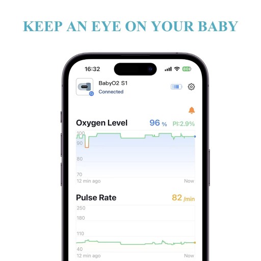 - Inteligentne Alarmy: Otrzymuj powiadomienia audio zarówno na urządzeniu, jak i w aplikacji mobilnej, jeśli poziom tlenu dziecka spadnie poniżej bezpiecznej wartości lub jeśli urządzenie zostanie przypadkowo usunięte.
