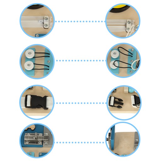 Podczas zabawy tablicą maluch będzie mógł przesuwać, wciskać, przekręcać i otwierać wszystkie elementów, dzięki czemu będzie ciągle rozwijać swoje umiejętności manualne, a także zaspokajać swoją ciekawość.