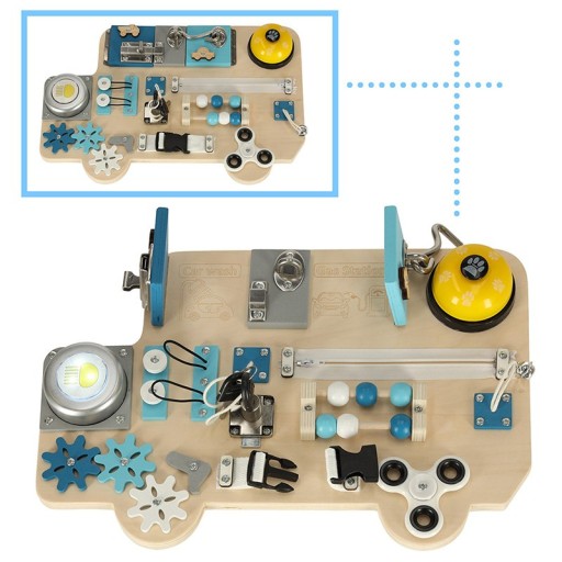 Ta tablica jest w kształcie autobusu, co z pewnością spodoba się każdemu miłośnikowi pojazdów. Elementy sensoryczne również nawiązują do motoryzacji - maluch znajdzie na tablicy drewniane autka, a także ukryte pod kolorowymi kwadratami rysunki stacji benzynowej i myjni samochodowej.