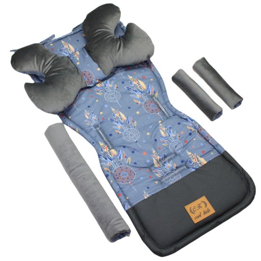 Materacyk - wkładka przystosowany jest do większości wózków spacerowych , otwory wyszyte w materacyku pozwalają na przeplecenie pięciopunktowych pasów bezpieczeństwa , poduszeczka motylek jest przypinana do materacyka a ochraniacze na pasy można łatwo zapiąć na pasach i barierce wózka .