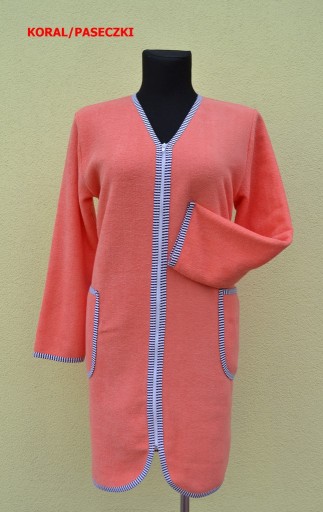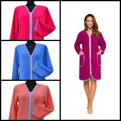 SZLAFROK DAMSKI Z DZIANINY TERMOFROTTE WYSOKIEJ JAKOŚCI, GRAMATURA 290, SKŁAD : BAWEŁNA CZESANA 80%, POLIESTER 20% SZLAFROK W JEDNYM KOLORZE, WYKOŃCZONY LAMÓWKĄ W BIAŁO-GRANATOWE PASECZKI, ZAPINANY NA EKSPRES, DWIE KIESZENIE, KOLORY DO WYBORU.