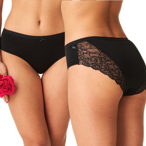 Figi damskie jednokolorowe w kolorze czarnym. Wykonane z mięciutkiej, elastyczne dzianiny z włókien bambusowych. Model typu midi bikini, o klasycznej linii zabudowy, z szerszymi bokami. Majteczki ozdobione koronką która dodaje zmysłowości. Mięciutkie, komfortowe i wygodne. Zestaw 2 sztuk. Figi polskiego producenta Key.