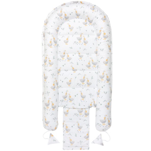 Gniazdko doskonale służy także starszym maluszkom stając się idealną przestrzenią do zabawy, leżenia na brzuszku i pierwszych ćwiczeń – podnoszenia główki czy leżących w jego zasięgu grzechotek. Rozwiązanie sznurków pozwala na używanie kokonu jako przewijaka.