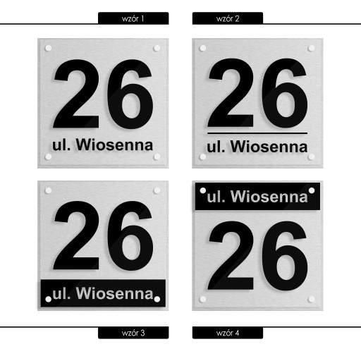 Tablica adresowa 25x25 szczotkowane aluminium - 4 wzory, 10 czcionek.