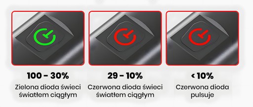 Tryby światła: 100% / 50% / 30% / wolne miganie / S.O.S. / szybkie miganie