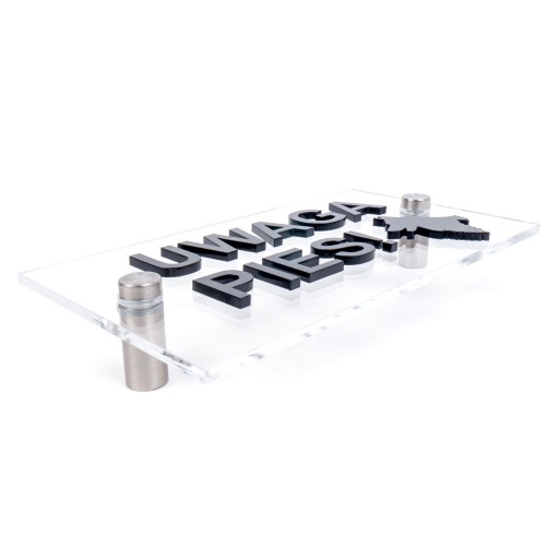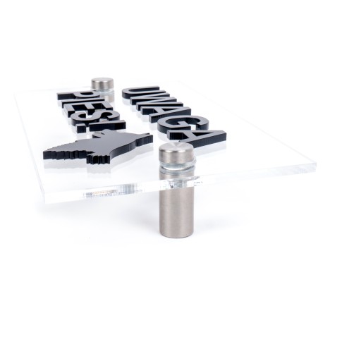 W zestawie znajdują się 2 dystanse montażowe. Są to elementy dzięki których w łatwy i elegancki sposób zamontują Państwo tablicę na elewacji. Dystans pozwala odseparować frontową przeźroczystą tablicę od elewacji co potęguje efekt trójwymiarowości.