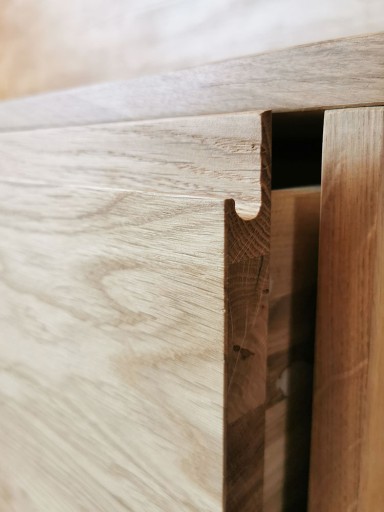Fronty z frezem pod palce zamiast uchwytów - jeszcze bardziej naturalny i minimalistyczny charakter mebla - brak elementów sztucznych na zewnątrz.