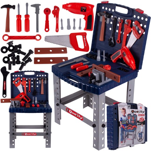 Na blacie i ściance stołu umieszczone są otwory umożliwiające przykręcanie śrub i innych elementów zawartych w zestawie. Dodatkowym urozmaiceniem zabawy są ruchome elementy narzędzi.