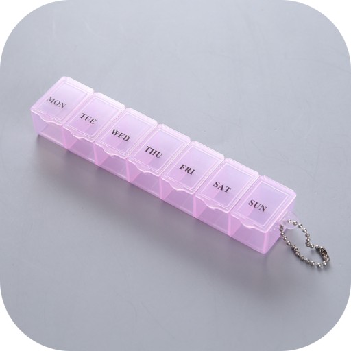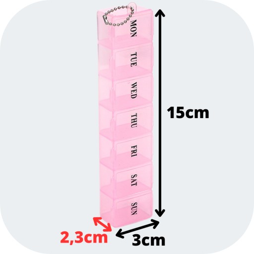 Każda z siedmiu przegród jest opisana dniem tygodnia w skrócie po angielsku, dzięki czemu bez trudu można odczytać, jaki lek należy przyjąć danego dnia. Pojemnik posiada również łańcuszek, który umożliwia zawieszenie go na haczyku lub przyczepienie do kluczyków.