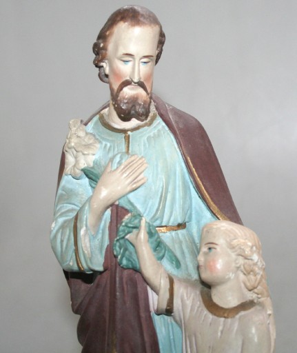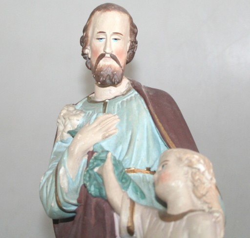 Stara, duża, gipsowa figura przedstawiająca Świętego Józefa i małego Jezuska.