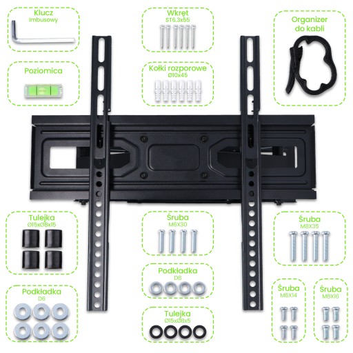 - Zestaw montażowy: Uchwyt, poziomica, 6x wkręt st6.3x55, 6x kołki rozporowe 10x45, klucz imbusowy, organizer kablowy, 4x śruba m6x30, 4x śruba m8x35, 4x podkładki d8, 4x tulejka Ø 15x8x15, 6x podkładka d6, 4x tulejka Ø 15x8x5, 4x śruba m6x14, 4x śruba m6x16, instrukcja obsługi