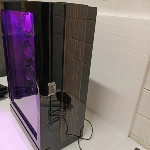 Luksusowa gablotka z czarno lakierowanego drewna z niebieskim podświetleniem LED, czarnym obiciem i czarnymi poduszkami piankowymi w optyce skóry.