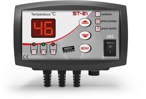 Regulator ST-21 z wyświetlaczem LED przeznaczony jest do sterowania pompą obiegu wody centralnego ogrzewania. Zadaniem regulatora jest załączanie pompy, gdy temperatura uzyska zadaną wartość oraz wyłączanie jej – jeśli kocioł wychłodzi się poniżej zadanej o wartość ustawionej histerezy. Taki tryb pracy zapobiega niepotrzebnemu działaniu pompy, co pozwala zaoszczędzić energię elektryczną jak również przedłuża żywotność pompy i podnosi jej niezawodność. Regulator ST-21 może również pełnić funkcję termostatu wyłączając pompę po osiągnięciu temperatury zadanej. Sterownik posiada również funkcję ANTYSTOP, która zapobiega zastaniu pompy obiegowej poza sezonem (pompa załącza sie co ok. 10 dni na 1 minutę). Dodatkowym zabezpieczeniem jest funkcja antyzamarzanie, która przeciwdziała zamarzaniu wody w instalacji, gdy temperatura spadnie poniżej 5°C pompa załączy się na stałe.