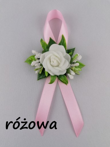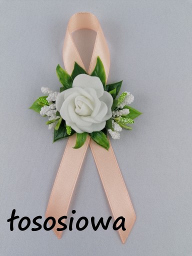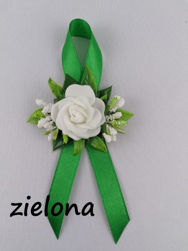 - na satynowej wstążce efektownie upięta jest biała róża i drobne biało-zielone dodatki