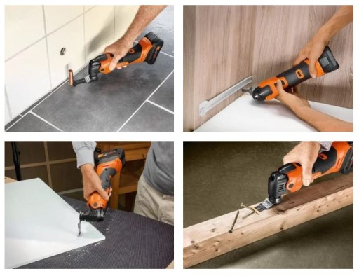 Wydajne akumulatorowe urządzenie MultiTool zapewniające szybki postęp pracy w ramach zabudowy i renowacji z ponad 30 akcesoriami – do piłowania w drewnie i metalu, szlifowania, cięcia płytek i innych zadań.