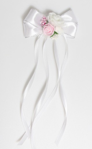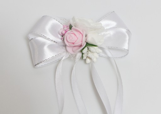 - OZDOBA NA ŚWIECĘ - kokardka ozdobiona kwiatkami, na białej,ozdobnej gumce, wielkość ok. 8cm x 5cm + zwisające wstążki.