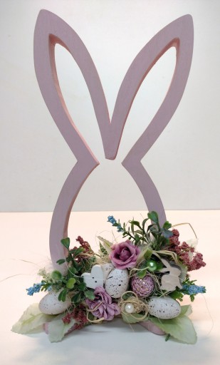 Wykonany z wysokiej jakości kwiatów sztucznych. Całość zachowana w pastelowej kolorystyce różu, białego, akcentu kolorystycznego dodają błękitne detale. Zajączek pięknie się prezentuje, odnajdzie się w wielu wnętrzach i posłuży jako ozdoba przez kilka lat.