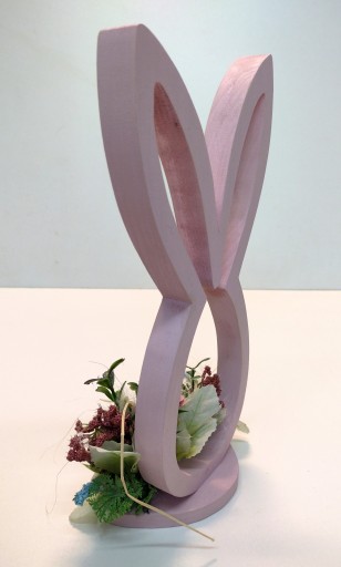Stroik wielkanocny, którego podstawą jest drewniany ręcznie wycięty zając, pomalowany na kolor różowy.