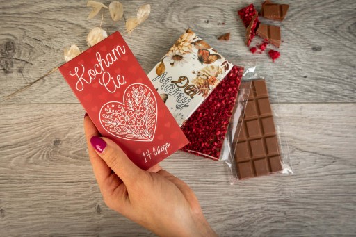 Doskonały upominek i świetna alternatywa dla popularnych kwiatów. Czekolada mleczna z manufaktury z malinami