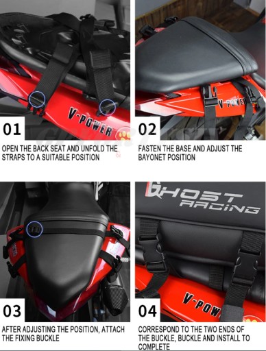 - Mocowanie za pomocą pasów – wystarczy owinąć pasy wokół ogona siedziska motocykla i zapiąć.