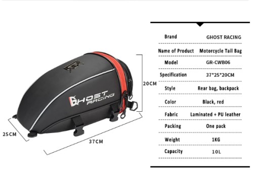 Przedstawiamy państwu wyjątkową ofertę jaką jest torba na tylne siedzenie Ghost Racing. Jest to uniwersalny produkt wykonany z materiałów bardzo wysokiej jakości. Pomocna szczególnie podczas krótkich wypadów poza miasto. 10L litrów pojemności to objętość wystarczająca aby schować do niej rzeczy których nie chcesz zostawiać przy motocyklu. Posiada dużo wygodnych kieszeni, jest odporna na zarysowania jest bardzo łatwa w montażu