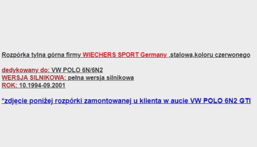 Rozpórka WIECHERS SPORT 515011 tylna stalowa VW POLO 6N/6N2 1994-2001