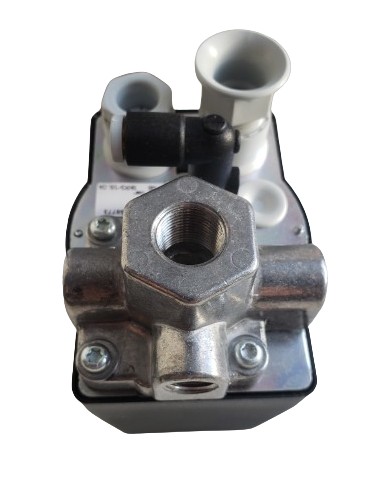 - wyłącznik posiada 3 przyłącza boczne 1/4" widoczne na zdjęciu po lewej stronie opisu. Przyłącza boczne 1/4" wykorzystuje się zwykle na montaż manometru (manometr osiowy 50 mm 0-16 bar przyłącze tylne dostępny na innej naszej aukcji), montaż zaworów bezpieczeństwa (na innej aukcji dostępny jest zawór bezpieczeństwa AIR TEK 11 bar 1/4"), dodatkowego szybkozłącza lub po prostu zaślepienie korkiem 1/4" (korek 1/4" sześciokąt mosiężny niklowany dostępny na innej aukcji)