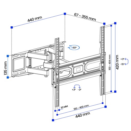 Uchwyt oferuje płynną regulację tj. nachylenie od 3° do -15°, obrót od - 60° do +60° i regulowaną odległość od ściany od 67 do 355 mm.