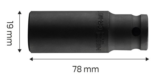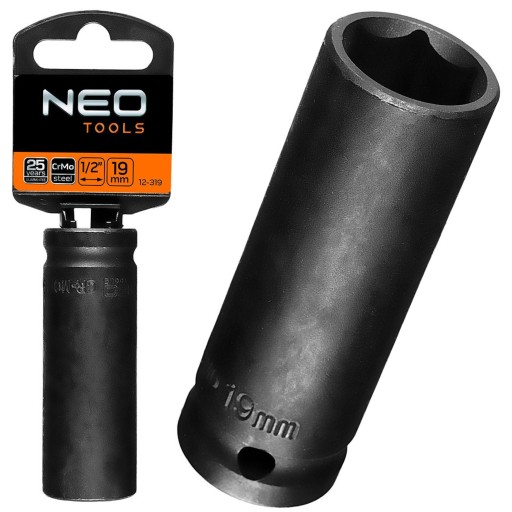 Nasadka udarowa 19 mm długa, 1/2" NEO (nr ref. 12-319). Wykonana z wytrzymałej stali chromowo-molibdenowej. Pogrubione ścianki nasadki gwarantują jej wysoka wytrzymałość. Większa długość nasadki umożliwia dostęp do głębokich gniazd śrub. Marka NEO spełnia oczekiwania profesjonalistów.