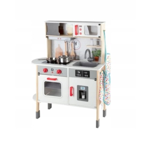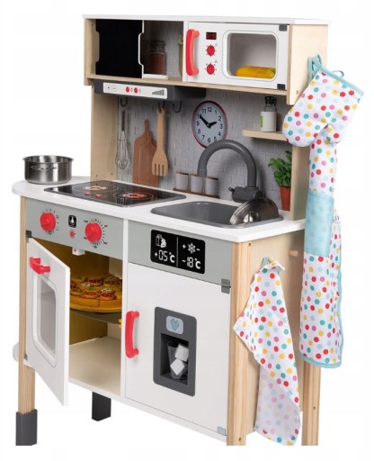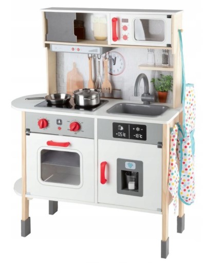 Drewniana kuchnia to idealna zabawka dla przyszłych mistrzów gotowania! W zestawie dziecko znajdzie elementy doskonale znane z domowej kuchni jak piekarnik, zlew z kranem, lodówkę z kostkarką oraz mikrofalówkę. Efekty świetlne i dźwiękowe okapu oraz płyty piernika umilą zabawę, dodadzą jej autentyczności i zaangażują na długie godziny.