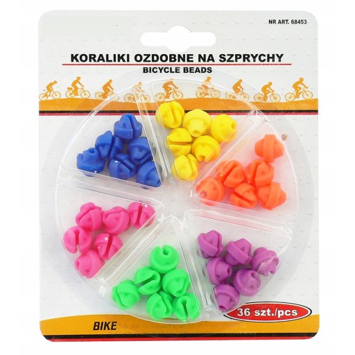 W tej ofercie znajdziesz 36 koralików na szprychy - wystarczających do ozdobienia obu kół roweru.