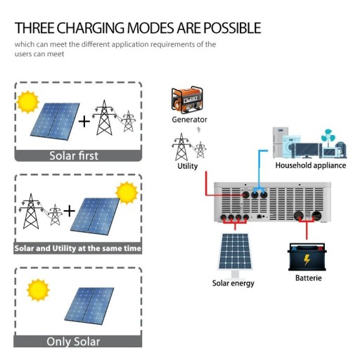 Jednocześnie za pomocą przyłączonych paneli pozwala na ładowanie akumulatorów energią słoneczną lub za pomocą wbudowanej ładowarki. Działa z panelami PV lub bez, z siecią 230V lub bez, i jako jeden z niewielu (absolutna nowość) obsługuje nawet 10,2kWp paneli.